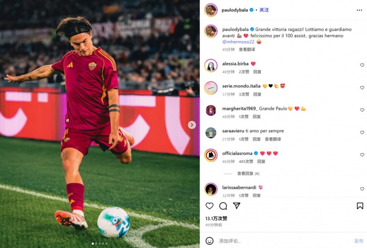 迪巴拉也在赛后通过社媒晒出自己的比赛照,并纪念道:“太棒了,伙计们!让我们继续努力前进????????❤️ 非常高兴拿到第100次助攻……谢谢兄弟@埃尔莫索 ????”